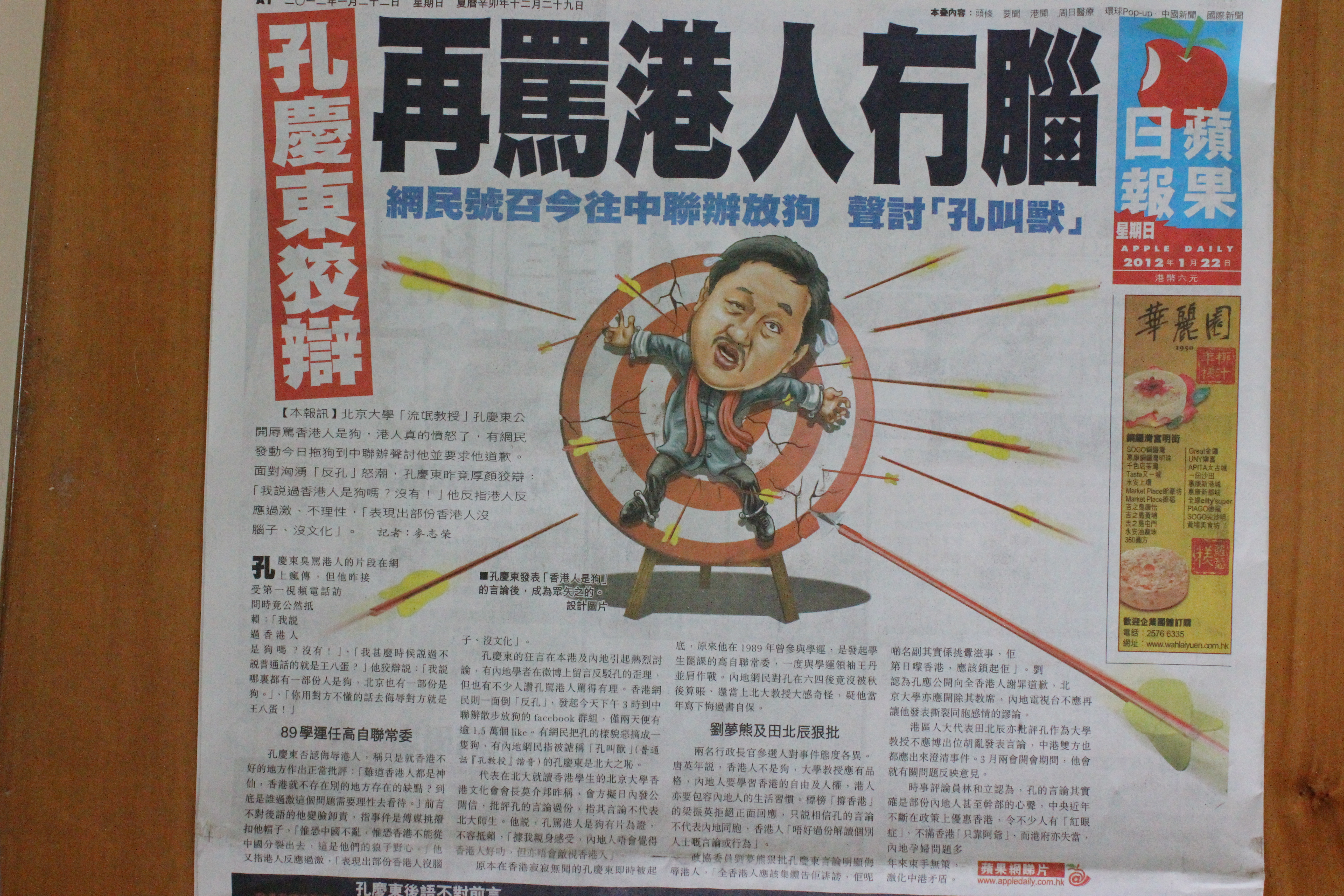 In response, Beijing professor Kong Qingdong lambasted the Hong Kong people on television, saying that they lacked morals and were no better than dogs — imperialist Britain’s dogs, nonetheless. When the video clip went up on Youtube two nights ago (which is not blocked in Hong Kong), I watched as the comments poured down the screen, every few seconds an offended watcher decrying Kong Qingdong’s lack of tact.