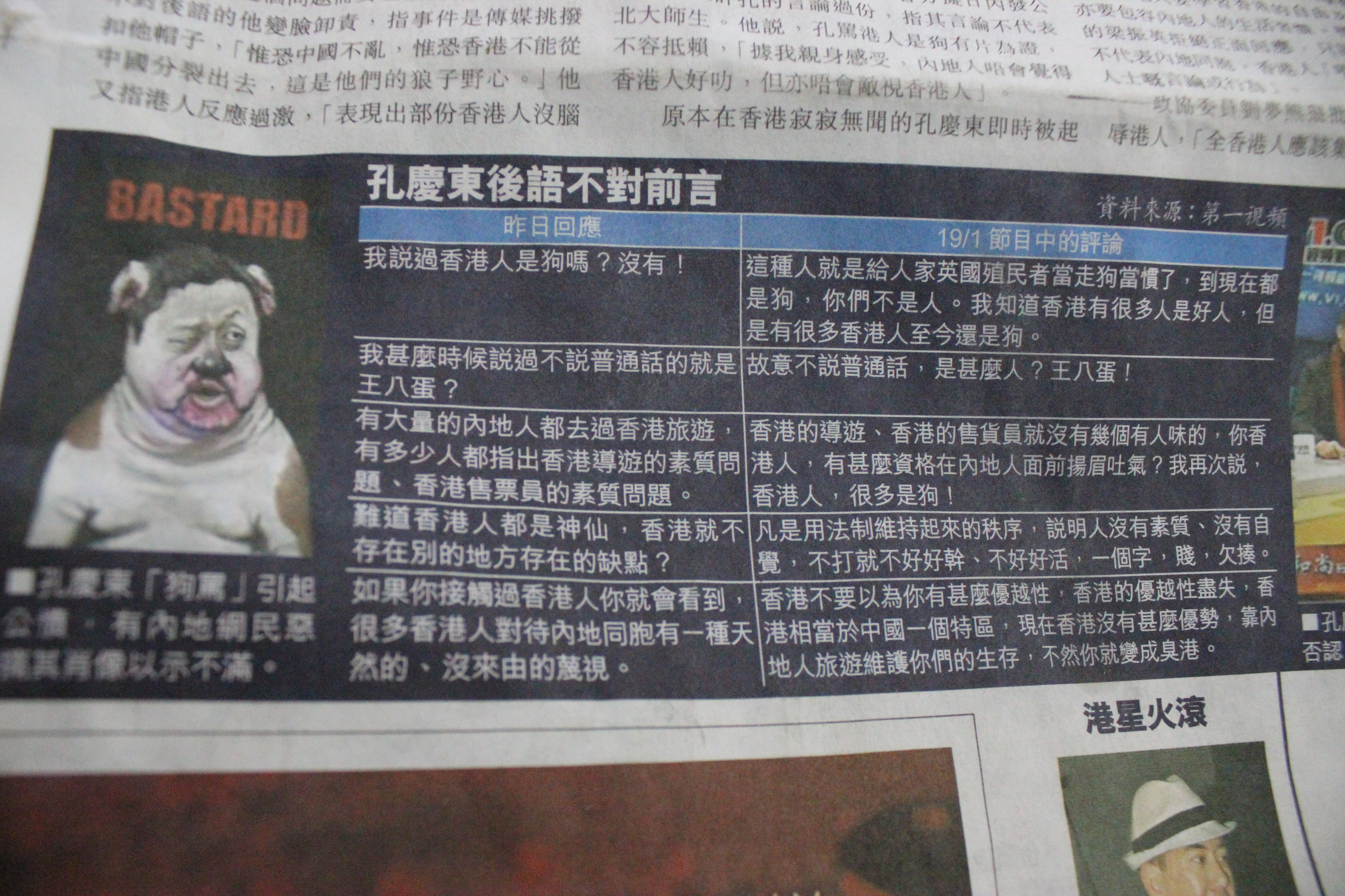 | “I said Hong Kong’ers are dogs? Not at all!” | “This type of person is simply used to being the dog of British imperialists. Up till now, they are all dogs; they are not people. I know Hong Kong has a lot of good people, but up till now there are still a lot ofHong Kong people who are still dogs.” |